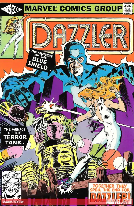 The first appearance of Blue Shield! Dazzler teams up with the vigilante hero in his battle against a crime boss. It turns out that Dazzler knows more about Blue Shield than she thought…