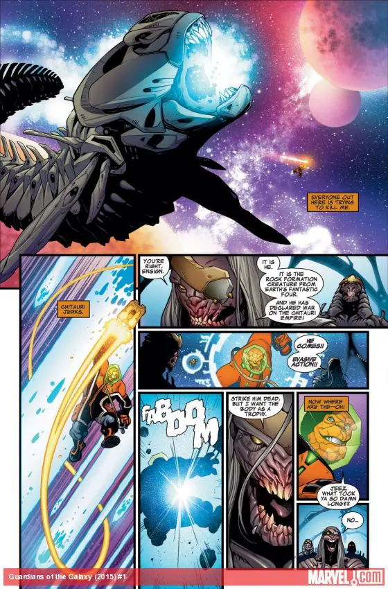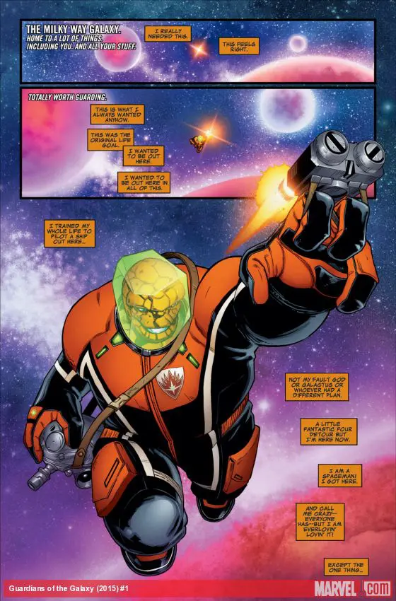 THE RACCOON'S IN CHARGE! Peter Quill has abandoned the Guardians and his role as Star-Lord to be Emperor of the Spartax. Rocket didn't wait a single minute to take the reins and become team leader of Drax, Venom, Groot, Kitty Pryde (A.K.A. Star-Lady ?!?!) and new Guardian BEN GRIMM, the everloving THING!