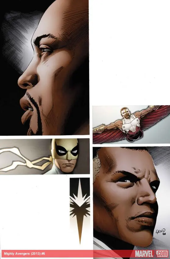 The Falcon is on the hunt - and what he finds will rock the Mighty Avengers to their core! Meanwhile, Luke Cage and Adam Brashear - aka the Blue Marvel - sit down and talk about dead Presidents, old mistakes and family ties. GUEST STARRING IRON FIST!